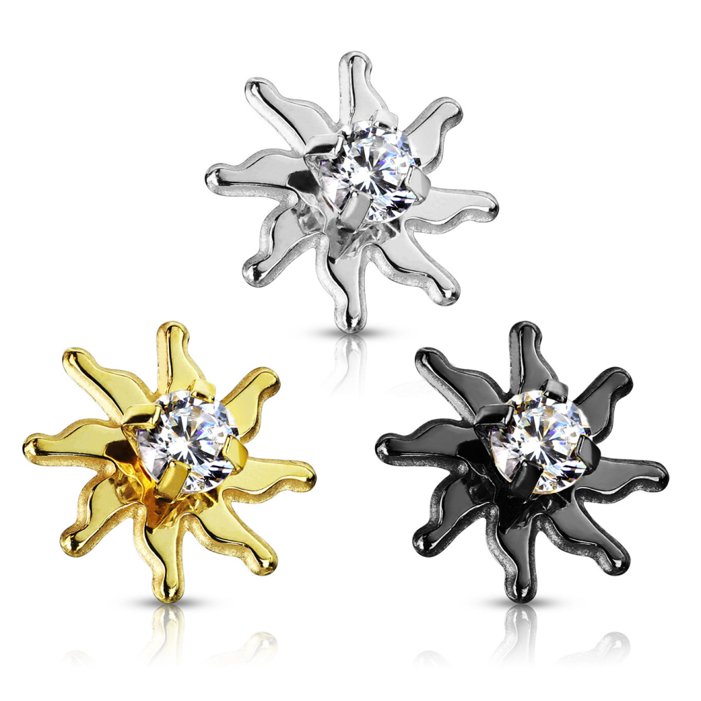 Dieser Aufsatz kann verwendet werden, wenn du bereits ein Dermal Anchor unter der Haut hast. Der Aufsatz wird einfach in deine existierende Basis geschraubt und anschließend hast du eine schöne scheinende Sonne auf der Haut sitzen. Die 8 Sonnenstrahlen sind leicht gewölbt und man hat das Gefühl, dass die Strahlen sich bewegen, da sie in die gleiche Richtung "weisen".