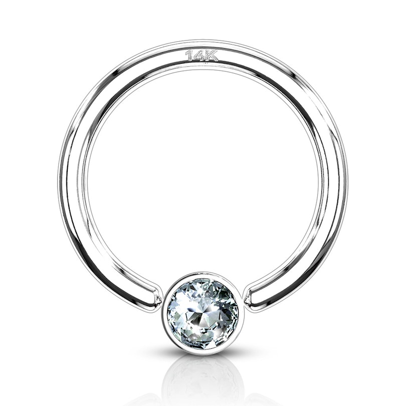 Ein so schöner Kugelring aus puren 14 karätigen Gold mit einem funkelnden, klaren Stein, der fast die ganze Kugel ausfüllt. Dieser Ring ist nicht nur ein Qualitätsprodukt aufgrund des Materiales, sondern auch aufgrund des femininen und zeitlosen Designs. Der Ring hat eine Stabstärke von 1,2 mm und 8 mm im Durchmesser eignet sich somit für viele Stellen am Körper. Hauptsache die Maße des Piercings und des Schmuckst stimmen überein, denn ein Ring ist ein wirklich universelles Schmuckstück. Die Kugel des Schmuckstück misst 3 mm.