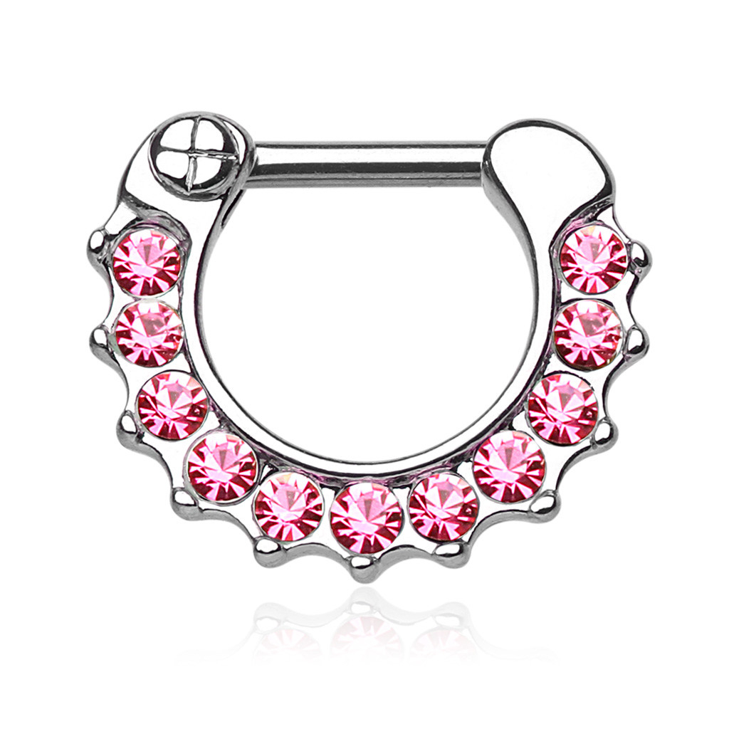 Sehr schöner und einfacher Septumclicker, klassisch jedoch nicht langweilig. Denn dieses Septumpiercing ist nämlich eng besitzt mit vielen glitzernden Steinen entlängs der gebogenen Kante. Insgesamt sitzen auf der 3 mm breiten Kante 11 facettengeschliffene Steine, die wie Diamanten funkeln. Diese Art des Schliffes fängt das Licht besser ein und reflektiert es für einen noch schöneren Glitzereffekt
